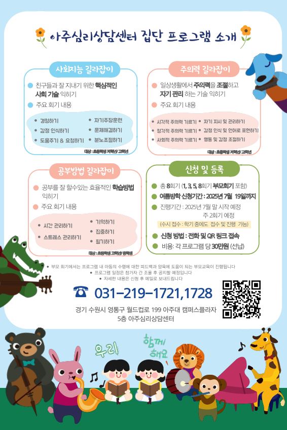 아주대학교 부설 아주심리상담센터에서는 올 여름방학 기간동안 자녀들의 사회성 발달, 주의력 향상, 학습능력 향상 프로그램을 진행합니다.
