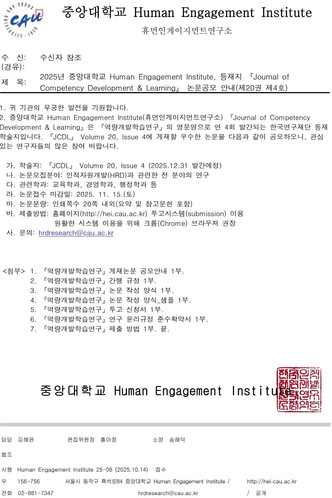 [기타] 2025년 중앙대학교 Human Engagement Institute 등재지『Journal of Competency Development & Learning』논문공모 안내(제20권 제4호)