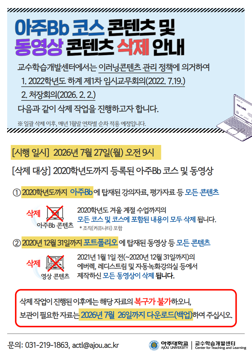 아주Bb 코스 콘텐츠 및 동영상 콘텐츠 삭제 안내
