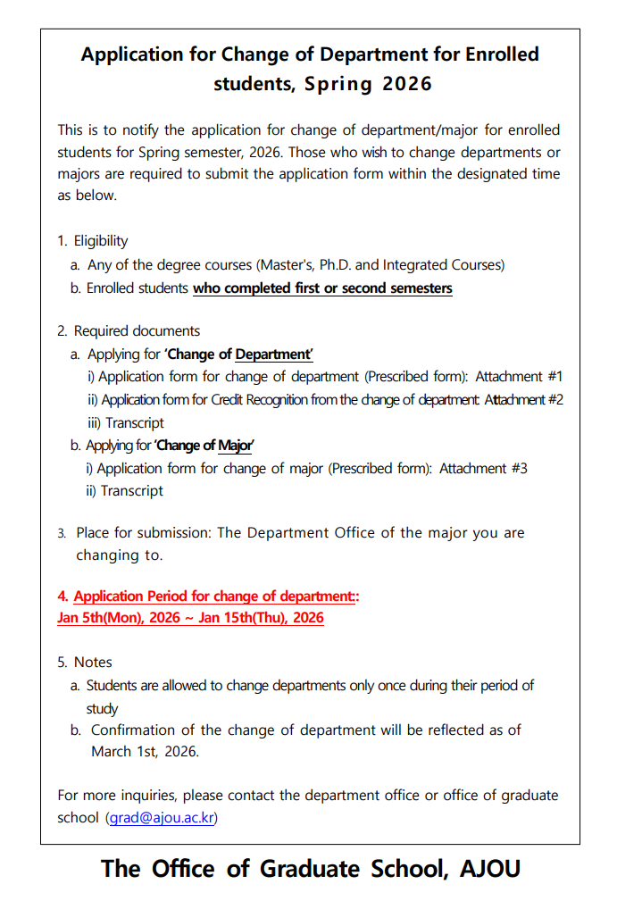 [Notice] Application for Change of Department for Enrolled students, Spring 2026